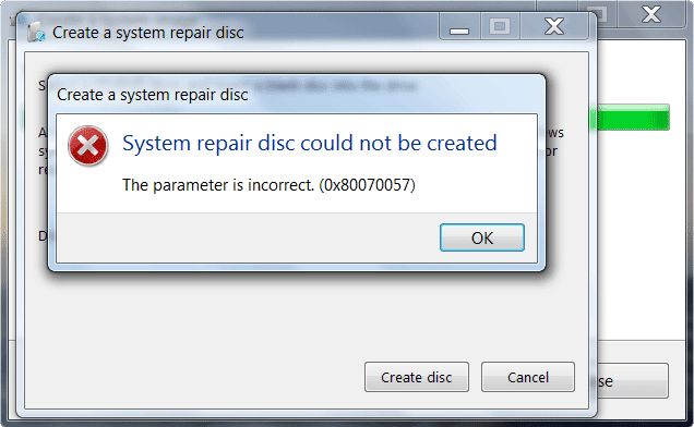 At the prompt type. The parameter is incorrect 0x80070057 I did some searches and found this problem has been around for quite a while but nothing I found in the various forums provided a definitive answer. System repair disk could not be created.