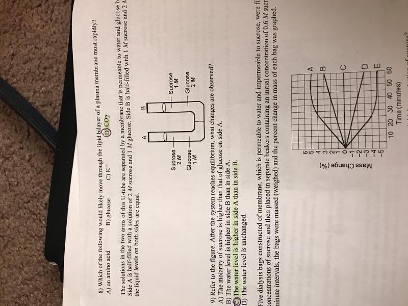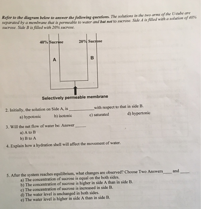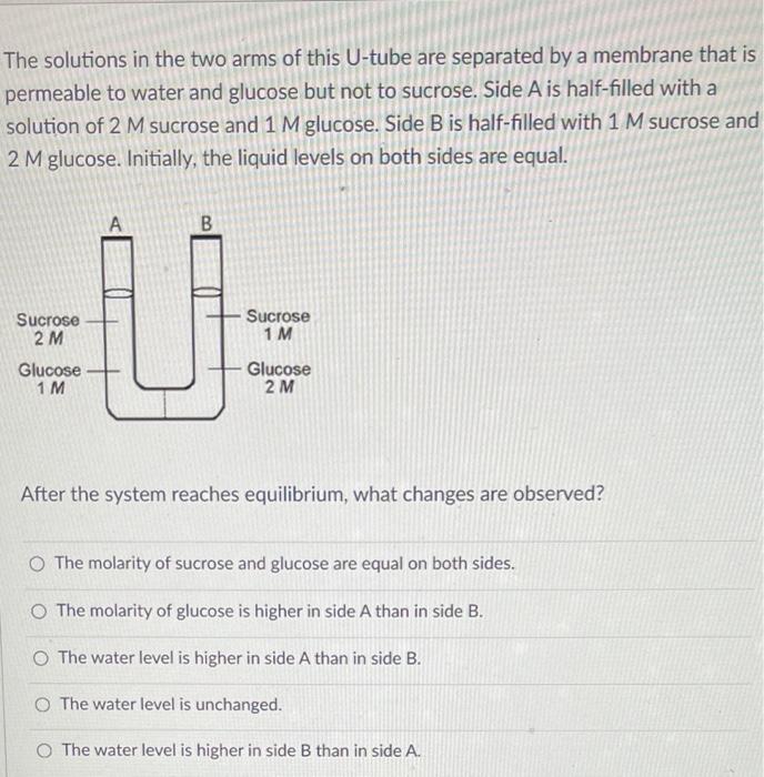 After the system reaches equilibrium what changes are observed. B The molarity of glucose is higher in side A than in side B. Animal cells are permeable to water and urea but NOT to sucrose.